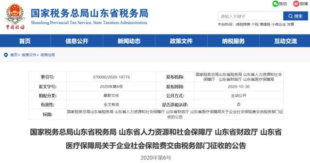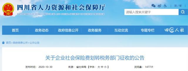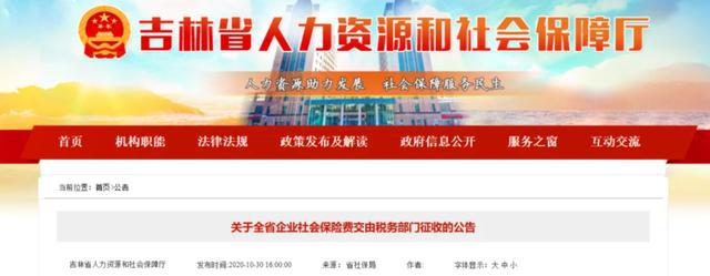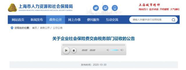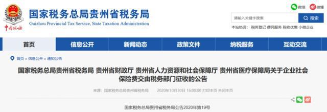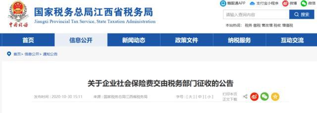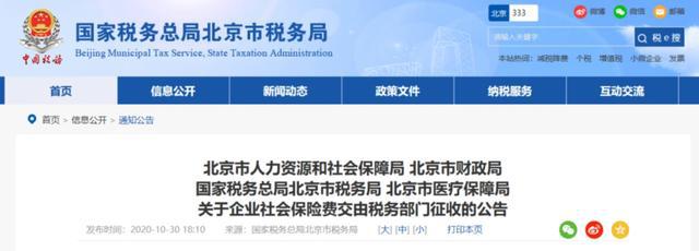 10月30日 北京、上海、山東、山西、湖南、四川、貴州、吉林、江西等地同時(shí)發(fā)布了《關(guān)于企業(yè)社會保險(xiǎn)費(fèi)交由稅務(wù)部門征收的公告》的通知。