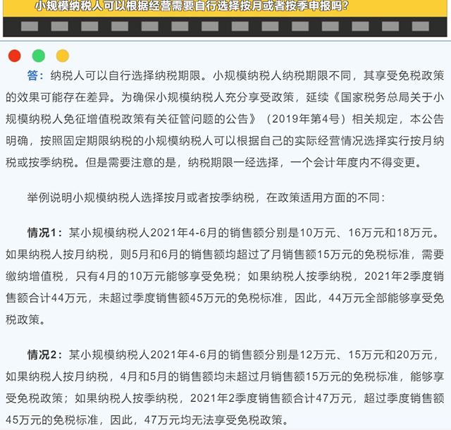 第二個(gè)問(wèn)題:小規(guī)模納稅人可以根據(jù)經(jīng)營(yíng)需要自行選擇按月或者按季申報(bào)嗎?