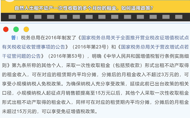 第三個(gè)問(wèn)題:自然人出租不動(dòng)產(chǎn)—次性收取的多個(gè)月份的租金,如何適用政策?