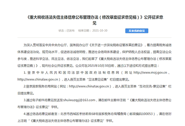 9月30日,國家稅務總局發(fā)布《重大稅收違法失信主體信息公布管理辦法》(修改草案征求意見稿):