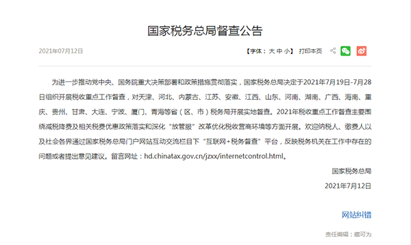 7月12日,國家稅務總局發(fā)布督查公告,涉及18個省份。