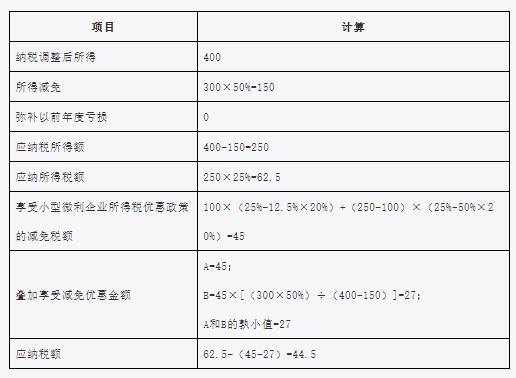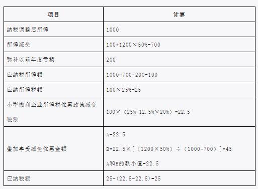 下面,以小型微利企業(yè)為例說明疊加享受減免稅優(yōu)惠的計算方法。企業(yè)選擇享受其他減免所得稅優(yōu)惠政策,可據(jù)此類推。